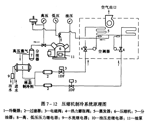 直接蒸發(fā)式表冷器的控制常常與制冷壓縮機的控制有關(guān)。為了說明制冷壓縮機的控制原理,先介紹一下制冷系統(tǒng)的工作過程,如圖7-12所示是壓縮機制冷系統(tǒng)圖。
