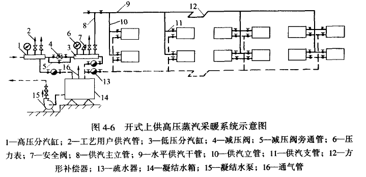 圖4-6為開(kāi)式上供高壓蒸汽采暖系統(tǒng)的示意圖。由鍋爐房將蒸汽輸送到熱用戶(hù)。首先進(jìn)入高壓分汽缸1,將高壓蒸汽分配給工藝生產(chǎn)用汽。高壓分汽缸上可分出多個(gè)分支,向有不同壓力要求的工藝用汽設(shè)備供汽。蒸汽經(jīng)減壓閥4減壓后進(jìn)入低壓分汽缸3。減壓閥設(shè)有旁通管5,供修理減壓閥時(shí)旁通蒸汽用。安全閥7限制進(jìn)入采暖系統(tǒng)的最高壓力不超過(guò)額定值。從低壓分汽缸3上還可以分出許多供汽管,分別供通風(fēng)空調(diào)系統(tǒng)的蒸汽加濕、汽水換熱器以及蒸汽加熱器和用蒸汽的暖風(fēng)機(jī)等用汽設(shè)備。系統(tǒng)中設(shè)有疏水器13,將沿途以及系統(tǒng)產(chǎn)生的凝結(jié)水排到凝結(jié)水箱14中,凝結(jié)水箱上有通氣管16通大氣、排除箱內(nèi)的空氣和二次蒸汽,也因此稱(chēng)為開(kāi)式系統(tǒng)。凝結(jié)水箱中的水由凝結(jié)水泵15送回凝結(jié)水泵站或熱源。