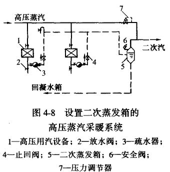 當(dāng)工業(yè)廠(chǎng)房中用汽設(shè)備較多,用汽量大時(shí),凝結(jié)水系統(tǒng)產(chǎn)生的二次蒸汽量大,還可以利用二次蒸。發(fā)箱將二次汽匯集起來(lái)加以利用。圖4-8是設(shè)置二次蒸發(fā)箱的高壓蒸汽采暖系統(tǒng)。高壓用汽設(shè)備1的凝結(jié)水通過(guò)疏水器3進(jìn)入二次蒸發(fā)箱5。二次蒸發(fā)箱設(shè)置在車(chē)間內(nèi)3m左右高度處。蒸汽在二次蒸發(fā)箱內(nèi)擴(kuò)容后產(chǎn)生的二次汽可加以利用。當(dāng)二次汽量較小時(shí),由高壓蒸汽供汽管補(bǔ)充??繅毫φ{(diào)節(jié)器7控制補(bǔ)汽量,以保持箱內(nèi)壓力20-40kPa(表壓力),并滿(mǎn)足二次蒸汽熱用戶(hù)的用汽量要求。當(dāng)二次蒸發(fā)箱內(nèi)二次汽量超過(guò)二次蒸汽熱用戶(hù)的用汽量時(shí),二次蒸發(fā)箱內(nèi)壓力增高,箱上安裝的安全閥6開(kāi)啟,排汽降壓。