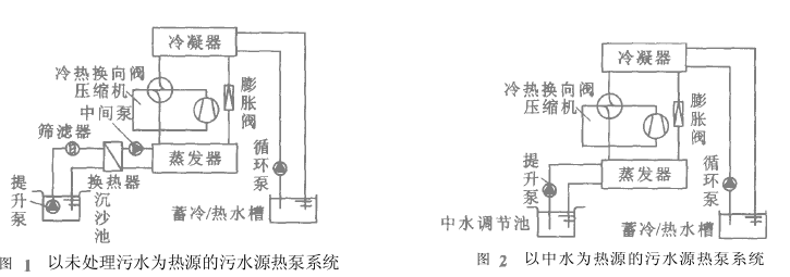 污水源熱泵系統(tǒng)可分為兩類:(1)以未處理污水為熱源;(2)以二級出水或中水為熱源。