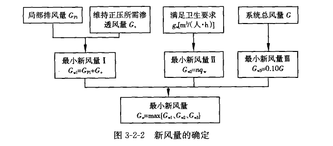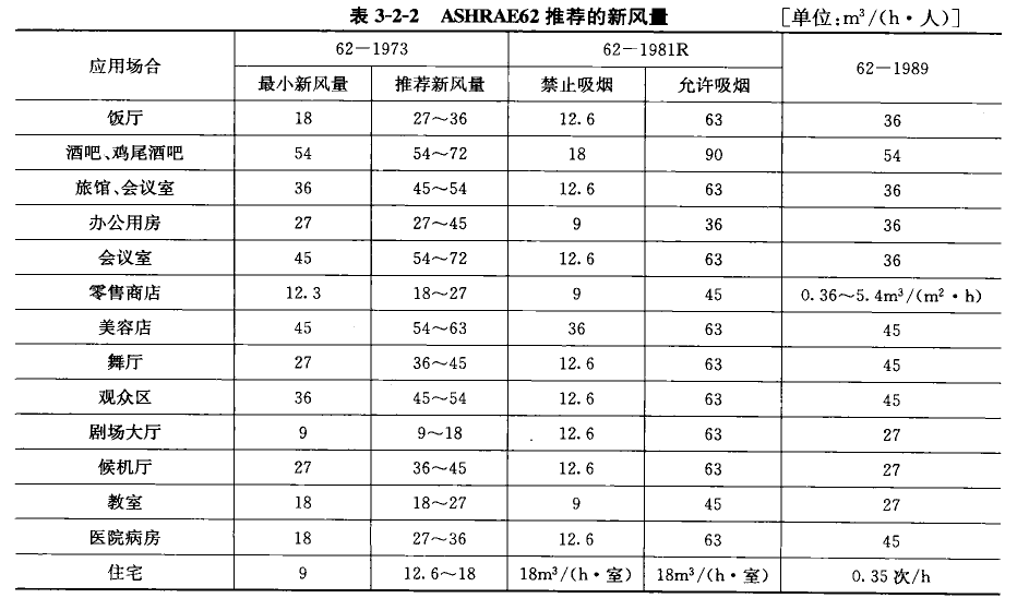 一般以稀釋室內(nèi)產(chǎn)生的C02,使室內(nèi)C02含量不超過01% (1L/m3)為基準,由此確定常態(tài)下每人新風量約為30m3/h。在實際工作中,可按《采暖通風與空氣調(diào)節(jié)設計規(guī)范》(GB 50019-2003)規(guī)定采用。對于人員密集和居留時間短暫的建筑物(如會堂、體育館等),新風量所形成的冷負荷比例很高,確定新風量時尤其應該慎重。表3-2-2給出美國ASHRAE62標準中每人所需室外新風量。