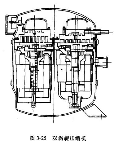 如圖3-25所示,雙渦旋壓縮機(jī)將兩個(gè)渦旋壓縮機(jī)封裝在同一鋼殼內(nèi),一個(gè)壓縮機(jī)為定轉(zhuǎn)速壓縮機(jī),而另一個(gè)為變轉(zhuǎn)速壓縮機(jī)。此類壓縮 機(jī)可裝較多潤(rùn)滑油和制冷劑,可保證壓縮機(jī)在多聯(lián)室內(nèi)機(jī)組時(shí)有較可靠潤(rùn)滑保證,并可實(shí)現(xiàn)無(wú)級(jí)調(diào)節(jié),且功率范圍較大。