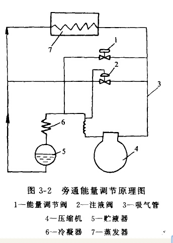 對(duì)于本身沒有能量調(diào)節(jié)裝置的中小型壓縮機(jī),可用旁通調(diào)節(jié)閥進(jìn)行能量調(diào)節(jié)。圖3-2為旁通能量調(diào)節(jié)原理圖。其能量調(diào)節(jié)的原理是;熱負(fù)荷下降時(shí),吸氣壓力將降低。當(dāng)?shù)陀谀芰空{(diào)節(jié)閥1的給定壓力時(shí),閥自動(dòng)打開,使部分高壓冷劑氣體直接旁通到吸氣管3。這樣既能防止吸氣壓力進(jìn)一步降低,又能使壓縮機(jī)的凈制冷量下降。