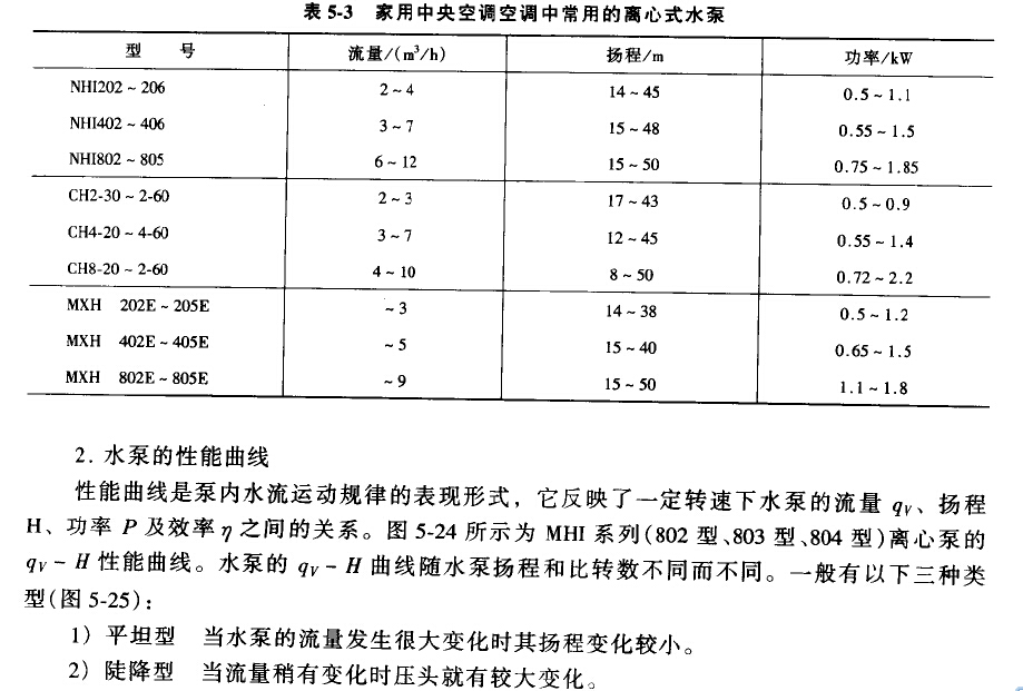 水泵型式的選擇與水系統(tǒng)的特點、安裝條件、運行調(diào)節(jié)要求和經(jīng)濟性等有關(guān)。家用中央空調(diào)系統(tǒng)要求水泵具有噪聲低、耐腐蝕和使用壽命長等特點。表5-3為家用中央空調(diào)的水系統(tǒng)中常用的離心式水泵。根據(jù)系統(tǒng)對流量和揚程的不同要求,可以分別選用單級泵或多級離心泵。