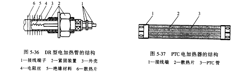 圖5-36是DR型電加熱管的結(jié)構(gòu)簡(jiǎn)圖。電加熱管是利用電流通過(guò)電阻絲,對(duì)空氣進(jìn)行加熱的設(shè)備。一般根據(jù)所需加熱功率,由電阻絲、外殼、散熱片和接線端等元件組裝而成。