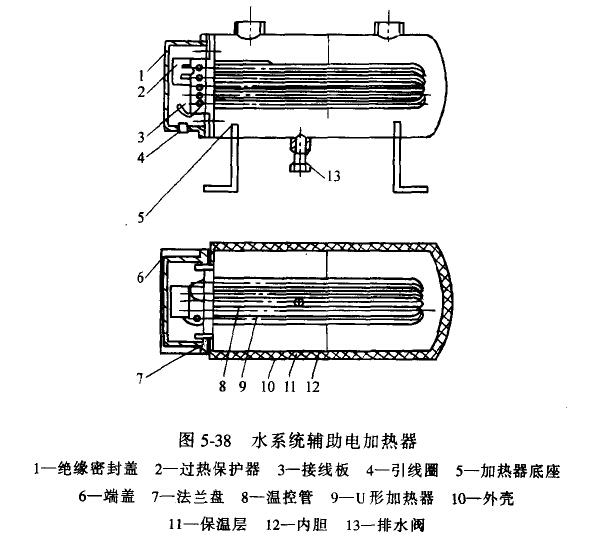 在冬季,家用中央空調(diào)的冷/熱水機(jī)組進(jìn)行制熱運(yùn)行時(shí),按照標(biāo)準(zhǔn)工況(室外溫度為7℃)選用的機(jī)組在室外溫度低于設(shè)計(jì)工況時(shí),其供熱可能滿足不了住宅所需的熱量,有必要增加輔助熱源,圖5-38所示的水系統(tǒng)輔助電加熱器就是其中一種。這種輔助電加熱器的結(jié)構(gòu)特點(diǎn)如下: