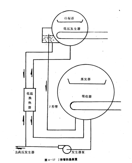 1.在低壓發(fā)生器和吸收器之間設置J形管防晶裝置,在溴化鋰吸收式制冷機中,溶液換熱器的濃溶液側最易結晶.設置J形管防晶裝置(圖4-17)后,當低溫換熱器結晶時,濃溶液不能回吸收器,低壓發(fā)生器的液位升高,便經J形管直接進入吸收器.而當發(fā)生器泵將溫度較高的溶液,經低溫換熱器送往低壓發(fā)生器時,就會使結晶自動清除.