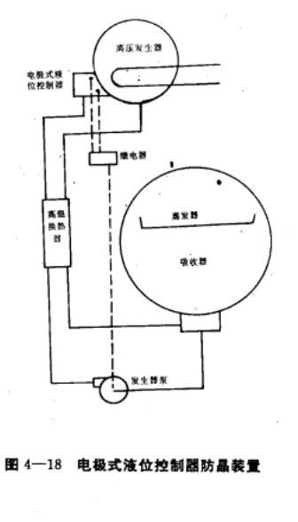 2.在高壓發(fā)生器的液囊中裝設電極式液位控制器.由于高壓發(fā)生器的壓力較高,它與吸收器之間不能采用J形管作為防晶裝置,可采用圖4-18所示的方法來消除結晶。當高溫換熱器結晶時,高壓發(fā)生器的液位升高,超出某一給定位置后,液位控制器動作.發(fā)生器泵停止運行,高壓發(fā)生器中的高溫溶液,由稀溶液管道經高溫換熱量倒汽回吸收器;高壓發(fā)生器液位降低后,由于液位控制器的作用.發(fā)生器泵重新運轉,把溫度較高的溶液,經高溫換熱器送入高壓發(fā)生器.如此反復對結晶部位進行加溫,就能使結晶消除.