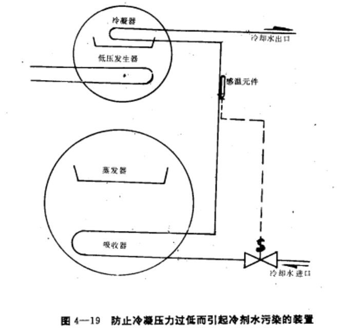 圖4-19是防止冷凝壓力過低而引起冷劑水污染的裝置,它是在吸收器冷卻水進口管道上裝設冷卻水量調節(jié)設備,通過改變冷卻水量來控制冷凝壓力,從而防止冷劑水污染.這種裝置雖然成本較高.但對于在冬季運行的機器,這種保護裝置還是必要的.