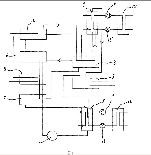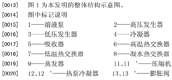利用熱泵回收熱能的溴化鋰制冷機(jī),包括高壓發(fā)生器、低壓發(fā)生器、蒸發(fā)器、吸收器、冷凝器、高溫?zé)峤粨Q器、低溫?zé)峤粨Q器、溶液泵、冷劑泵、控制系統(tǒng)及連接各部件的管路、閥,其特征在于:吸收器和冷凝器設(shè)計(jì)成熱泵蒸發(fā)器,并且將熱泵蒸發(fā)器的蒸發(fā)管代替吸收器和/或冷凝器中的冷卻管,并將吸收器和/或冷凝器中的冷卻管分別與壓縮機(jī)、熱泵冷凝器和膨脹閥串聯(lián)構(gòu)成熱泵機(jī)組,從而能夠?qū)寤囍评錂C(jī)中吸收器和冷凝器釋放出來(lái)的熱量通過(guò)熱泵機(jī)組轉(zhuǎn)換成較高品位的熱量后加以再利用。其優(yōu)點(diǎn)是:生產(chǎn)效率高,提高制冷機(jī)運(yùn)行穩(wěn)定性和適應(yīng)性。
