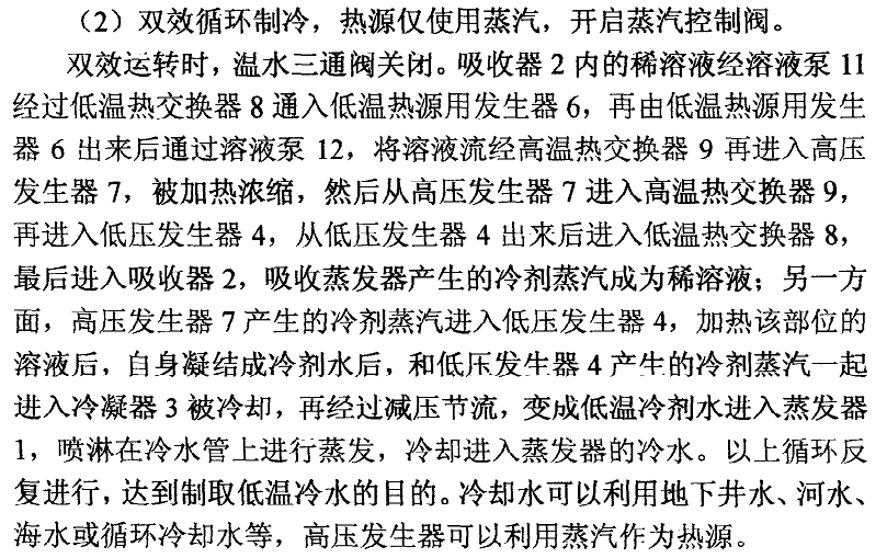 吸收器2內(nèi)的稀溶液經(jīng)溶液泵11經(jīng)過低溫?zé)峤粨Q器8通入低溫?zé)嵩从冒l(fā)生器6,被單效熱源熱水加熱濃縮,由低溫?zé)嵩从冒l(fā)生器6出來后經(jīng)溶液泵12、高溫?zé)峤粨Q器9進(jìn)入高壓發(fā)生器7,被加熱濃縮后進(jìn)入高溫?zé)峤粨Q器9,再進(jìn)入低壓發(fā)生器4,然后經(jīng)溶液泵1 3進(jìn)入低溫?zé)峤粨Q器8,最后進(jìn)入吸收器2,吸收蒸發(fā)器產(chǎn)生的冷劑蒸汽成為稀溶液:另一方面,高壓發(fā)生器7產(chǎn)生的冷劑蒸汽先進(jìn)入低壓發(fā)生器4,加熱該部位的溶液后,自身凝結(jié)成冷劑水后,和低壓發(fā)生器4產(chǎn)生的冷劑蒸汽一起進(jìn)入冷凝器3被冷卻,同時(shí)低溫?zé)嵩从冒l(fā)生器6產(chǎn)生的冷劑蒸汽進(jìn)入低溫?zé)嵩从美淠?被冷卻,然后經(jīng)管路16進(jìn)入冷凝器3,與在冷凝器3被冷卻的冷劑混合后,經(jīng)過減壓節(jié)流,變成低溫冷劑水進(jìn)入蒸發(fā)器l,噴淋在冷水管上進(jìn)行蒸發(fā),冷卻進(jìn)入蒸發(fā)器的冷水。以上循環(huán)反復(fù)進(jìn)行,達(dá)到制取低溫冷水的目的。低溫?zé)嵩纯梢岳锰柲軣崴?、?nèi)燃發(fā)電機(jī)缸套水、工藝廢熱水等,冷卻水呵以利用地下井水、河水、海水或循環(huán)冷卻水等,高壓發(fā)生器可以利用蒸汽作為熱源。