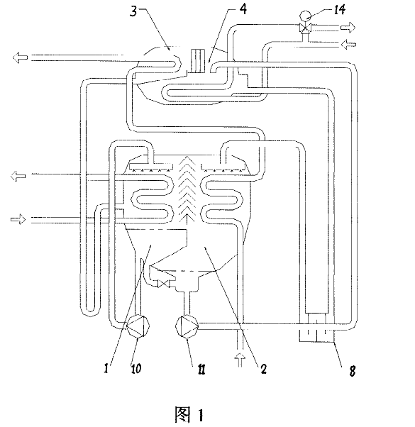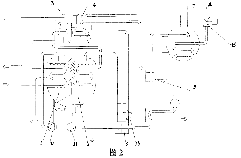 如圖3所示的低溫水/蒸汽單雙效溴化鋰吸收式制冷機(jī),機(jī)組包括下筒和上筒,下筒由蒸發(fā)器1和吸收器2構(gòu)成,上筒由冷凝器3和低壓發(fā)生器4構(gòu)成,蒸汽型高壓發(fā)生器與下筒經(jīng)溶液泵、低溫交換器由連接配管連通,蒸汽型高壓發(fā)生器與上筒經(jīng)高溫?zé)峤粨Q器由連接配管連通,在機(jī)組里增加一個(gè)上上筒,上上筒由低溫?zé)嵩从美淠?和低溫?zé)嵩从冒l(fā)生器6組成,低溫?zé)嵩从美淠?通過冷劑管16連通冷凝器3,低溫?zé)嵩从美淠骼鋮s水管17與冷凝器冷卻水管相連通,吸收器2經(jīng)溶液泵11的稀溶液管18連通低溫?zé)嵩从冒l(fā)生器6,低溫?zé)嵩从冒l(fā)生器出來的中間溶液管19一路連溶液泵12,一路經(jīng)連通管20連低壓發(fā)生器4出來的濃溶液管21,低溫?zé)嵩从冒l(fā)生器中通介質(zhì)為熱水的熱源管22,熱源管上有閥門14,上上筒布置在上筒23上方。高壓發(fā)生器7結(jié)構(gòu)為蒸汽型發(fā)生器,安裝蒸汽控制閥。根據(jù)負(fù)荷及熱源情況,通過控制溫水三通閥14和溶液泵12、蒸汽控制閥15,可分別實(shí)現(xiàn)單效循環(huán)制冷、雙效循環(huán)制冷、單雙效同時(shí)運(yùn)轉(zhuǎn)制冷。