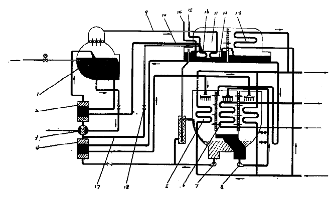 多能源烈效型溴化鋰吸收式制冷機(jī),包括高壓發(fā)生器(1)、低壓發(fā)生器(11)、蒸發(fā)器(6)、吸收器(5)、冷凝器(13)、高溫?zé)峤粨Q器(2)、低溫?zé)峤粨Q器(4)、溶液泵(7)、冷劑泵(8)、及連接各部件的管路、閥,其特征在于所述的低壓發(fā)牛器(11)是復(fù)合型低壓發(fā)生器,存低溫?zé)峤粨Q器(4)稀溶液管路引一路(17)直接進(jìn)入復(fù)合型低壓發(fā)生器(11),管路(17)上加裝調(diào)節(jié)閥(18)。木實(shí)用新型通過同時(shí)設(shè)置直燃高壓發(fā)生器和復(fù)合型低壓發(fā)生器,使機(jī)組能同時(shí)或分別利用熱水或直接燃燒燃料產(chǎn)生的熱量驅(qū)動(dòng)運(yùn)行。