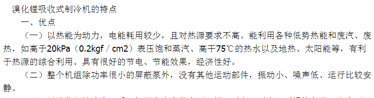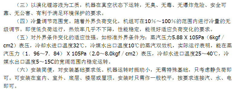溴化鋰吸收式制冷機工作原理:溴化鋰吸收式制冷機是以溴化鋰溶液為吸收劑,以水為制冷劑,利用水在高真空下蒸發(fā)吸熱達到制冷的目的。為使制冷過程能連續(xù)不斷地進行下去,蒸發(fā)后的冷劑水蒸氣被溴化鋰溶液所 吸收,溶液變稀,這一過程是在吸收器中發(fā)生的,然后以熱能為動力,將溶液加熱使其水份分離出來,而溶液 變濃,這一過程是在發(fā)生器中進行的。發(fā)生器中得到的蒸汽在冷凝器中凝結(jié)成水,經(jīng)節(jié)流后再送至蒸發(fā)器中蒸發(fā)。如此循環(huán)達到連續(xù)制冷的目的。