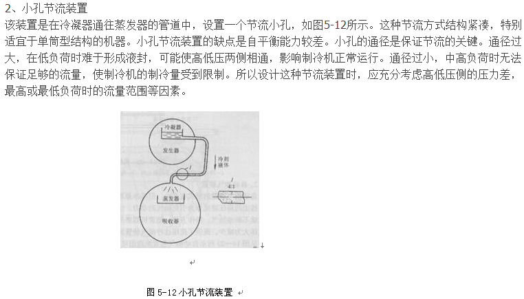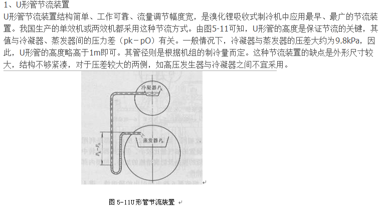 節(jié)流裝置是一個(gè)重要部件。它有多種型式??梢允轻槧罟?jié)流閥,浮球閥、U形管或小孔節(jié)流元件。溴化鋰吸收式制冷機(jī)中最常用的是U形管和小孔節(jié)流元件。