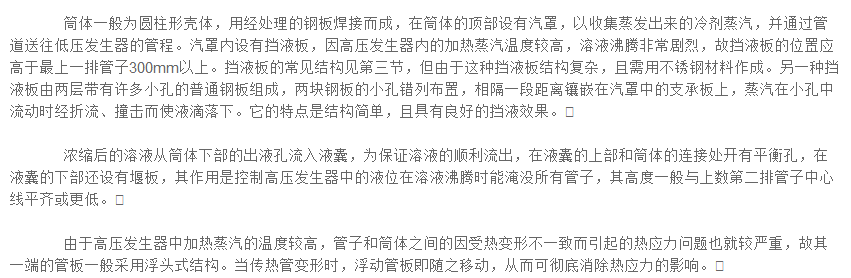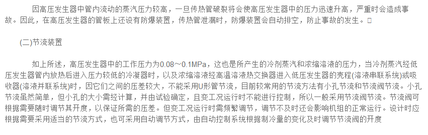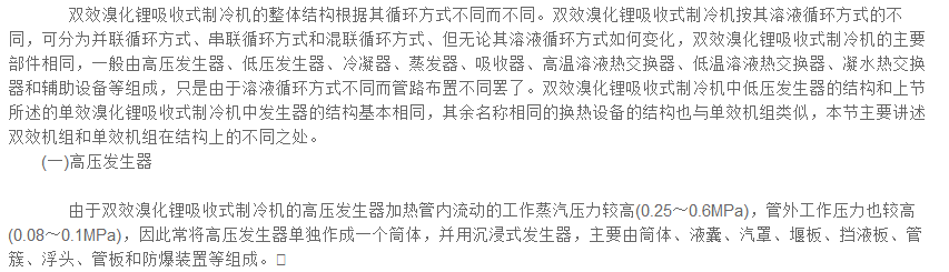 如果機(jī)組制冷量較大,則下筒體就顯得笨重,運(yùn)輸和安裝都不方便,這時(shí)一般把下筒體再分成兩個(gè)部分,即把低壓發(fā)生器和冷凝器單獨(dú)設(shè)置在一個(gè)筒體中,把蒸發(fā)器和吸收器設(shè)置在另一個(gè)筒體中。這時(shí)常把高壓發(fā)生器筒體和低發(fā)----冷凝筒體并列安放在蒸發(fā)----吸收筒體的上部、即構(gòu)成三筒型溴化鋰吸收式制冷機(jī)。目前國內(nèi)的雙效溴化鋰吸收式制冷機(jī)制冷量在1750kW(150×104kcal/h)以上的一般為三筒型,制冷量在600kW(50×104kcal/h)以下的一般為雙筒型,600~1750kW之間的機(jī)組可根據(jù)需要靈活選用。