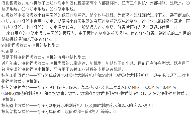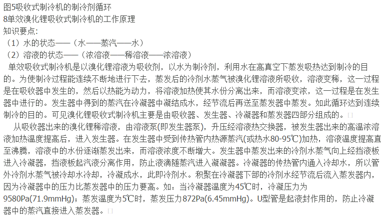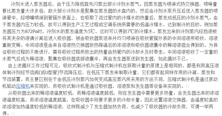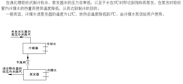 溴化鋰吸收式制冷機(jī)中的制冷劑就是水。水在制冷循環(huán)中狀態(tài)不斷改變,并利用其在蒸發(fā)時(shí)的吸熱而產(chǎn)生制冷的。