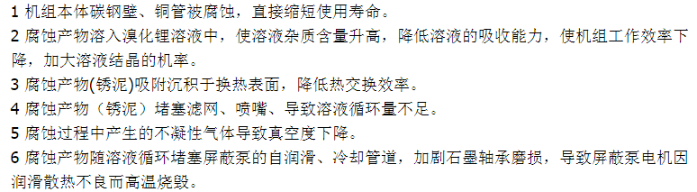 溴化鋰機組在使用過程中由于緩蝕劑不斷的消耗其含量逐漸不足,再加上機組氣密性不佳時氧氣的侵入,造成溴化鋰溶液的腐蝕性增強,加上銅(Cu2+)鐵(Fe3+)離子的相互(電位差)腐蝕,機組經(jīng)常出現(xiàn)一下問題: