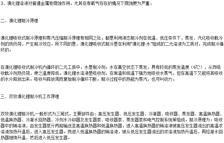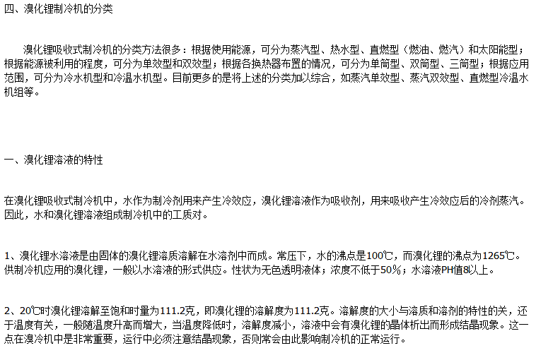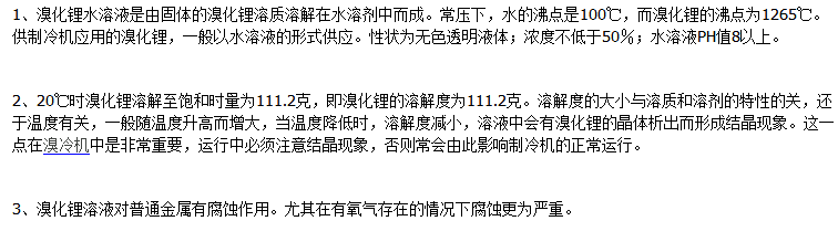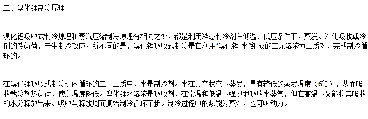 在溴化鋰吸收式制冷機(jī)中,水作為制冷劑用來產(chǎn)生冷效應(yīng),溴化鋰溶液作為吸收劑,用來吸收產(chǎn)生冷效應(yīng)后的冷劑蒸汽。因此,水和溴化鋰溶液組成制冷機(jī)中的工質(zhì)對。