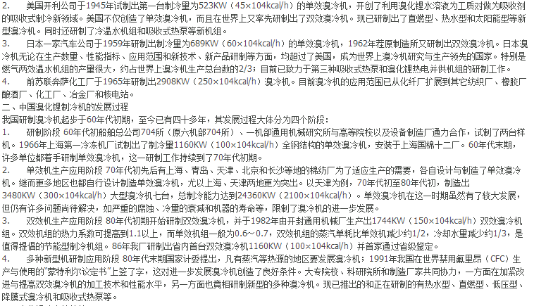 1. 美國(guó)是溴化鋰制冷機(jī)的創(chuàng)始國(guó),目前日本等國(guó)的溴冷機(jī)也都有較大的發(fā)展。