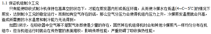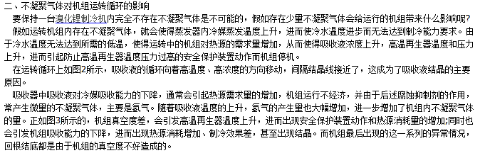 溴化鋰吸收式制冷機(jī)是一種必須保持高度真空狀態(tài)才能進(jìn)行穩(wěn)定工作的制冷設(shè)備。為此,應(yīng)將機(jī)組內(nèi)的空氣以及其他不凝聚性氣體及時(shí)排出。必須保證高真空度的原因: